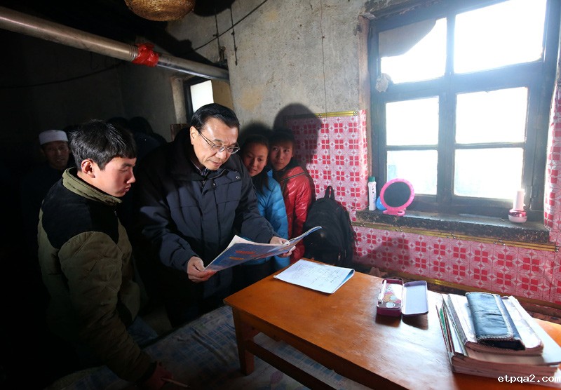 2016年2月1日,李克强在宁夏固原西吉县半子沟村看望特困村民王进宝一家。(资料图)