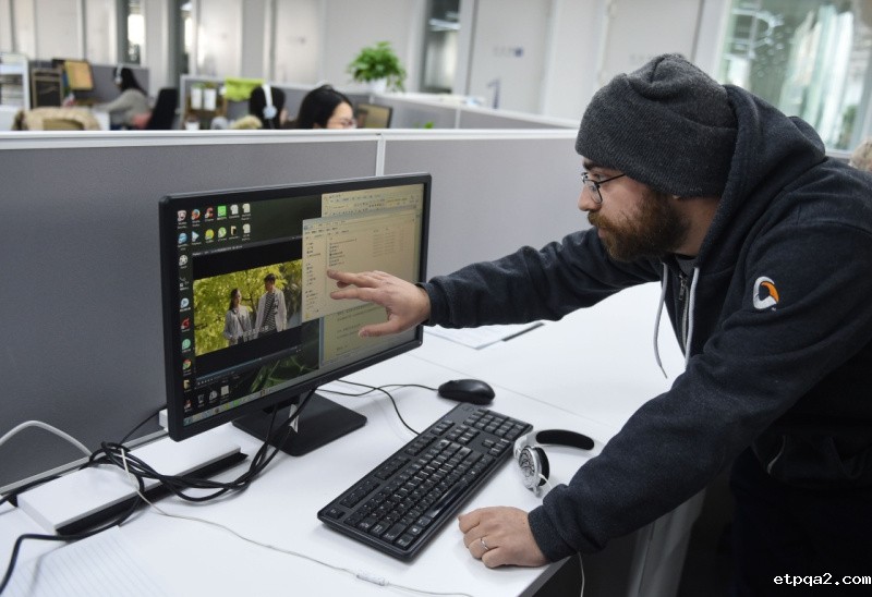 戴着耳机,盯着屏幕……工位前,29岁的法国小伙雨果正全神贯注地审听电视剧《拥抱星星的月亮》的法文。