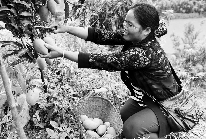 图为弥勒市江边乡的壮族农妇张玉英在采摘芒果。在当地政府的引导和帮助下,她家种植芒果实现了脱贫,年收入达10万元以上。