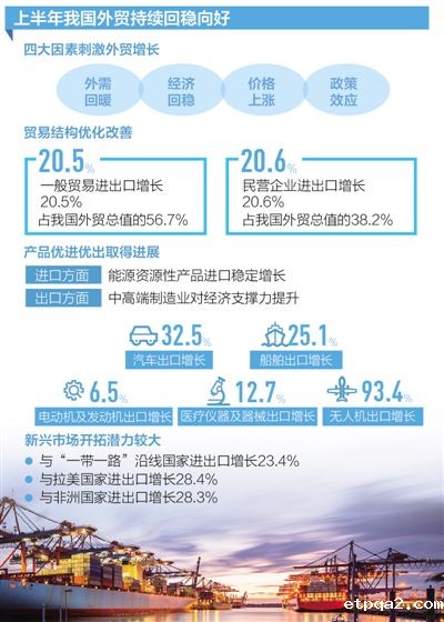 贸易结构继续优化、改善。一是贸易方式更趋合理。一般贸易进出口增长20.5%,占我国外贸总值的56.7%,较去年同期提升0.4个百分点。二是进出口市场更趋多元化。上半年,对欧美日等传统市场进出口增长18.9%,同时对俄罗斯、巴基斯坦、波兰、孟加拉国等“一带一路”沿线国家进出口分别增长33.1%、14.5%、24.6%和15.5%。三是内生动力更趋强劲。民营企业进出口增长20.6%,占我国外贸总值的38.2%,较去年同期提升0.3个百分点。
