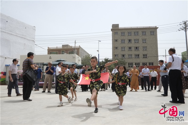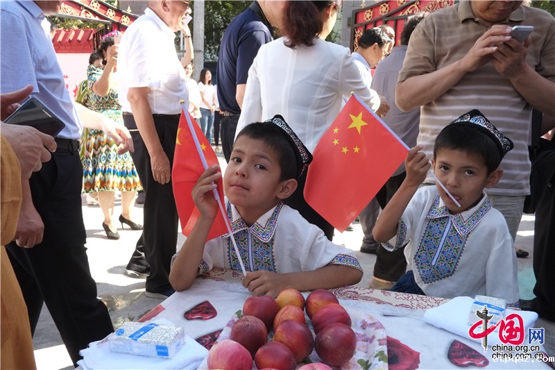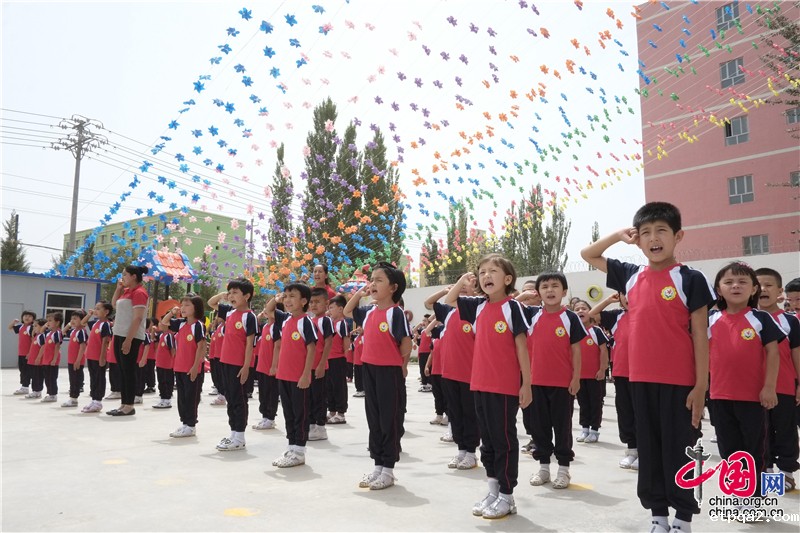 7月的新疆大地,绿意盎然、瓜果飘香。和田市库木巴格幼儿园内,各民族小朋友组成的升旗方队正在举行一场隆重的升旗仪式,身着迷彩服的小升旗手跨着整齐的步伐,在响亮的国歌声中将国旗徐徐升起,维吾尔族小升旗手用流利标准的普通话进行了一场精彩的演讲……这是他们的日常活动之一,也为欢迎一群远方客人的到来。