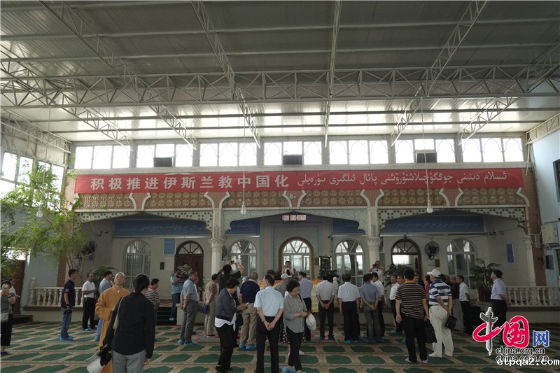 和田市斯迪吐维清真寺内,醒目悬挂着“积极推进伊斯兰教中国化”横幅