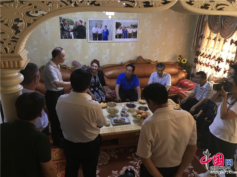 调研组在新疆生产建设兵团第十四师四十七团百果社区调研嵌入式社区建设情况,图为在维吾尔族群众家里走访