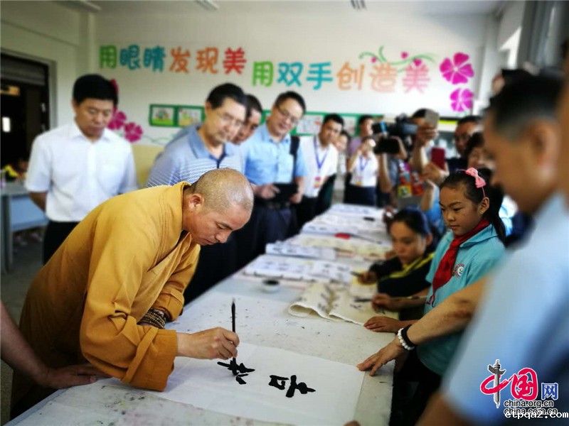 调研组成员为正在练习书法的孩子们留下书法寄语,鼓励孩子们学好中华传统文化(摄影:彭毛才旦)