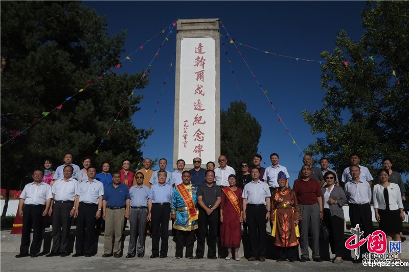 调研组成员在塔城市阿西尔达斡尔民族乡西征园内,达斡尔戍边纪念碑前与当地群众合影