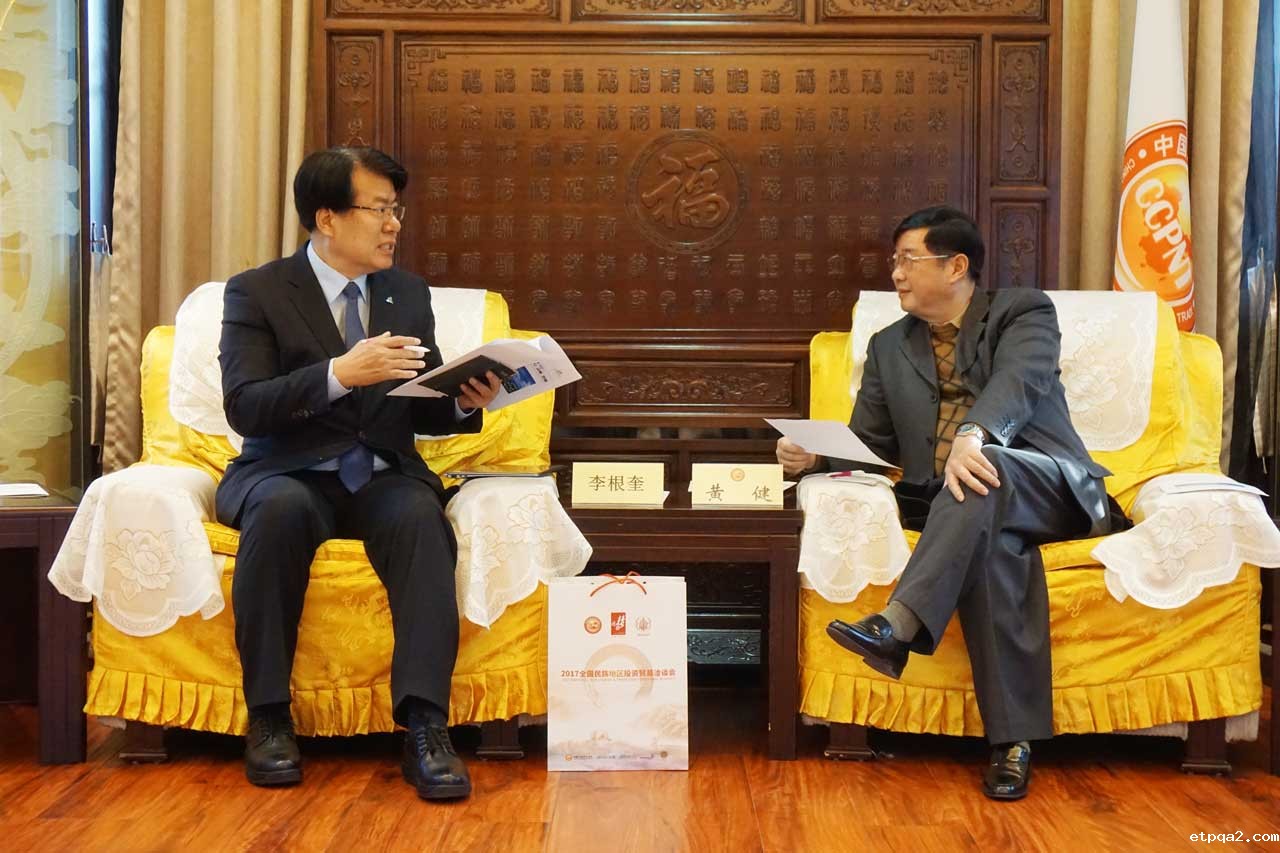 黄健首先对来访的李根奎市长一行表示欢迎。黄健说,中国政府高度重视发展中医药和民族医药事业,我国的民族医药正处于快速发展期。民贸会已于今年年初与中国民族医药协会签订了合作协议,并于刚刚成功举办的“2017全国民族地区投资贸易洽谈会”上正式宣布民族医药基金开始筹建。黄健指出,中国幅员辽阔,民族地区有着丰富的民族医药资源,但许多资源都“养在深闺无人识”。为了扭转这个现状,目前我会正在与中央民族大学沟通,共同打造民族医药大实验室,同时与民族医药协会共同筹建的民族医药办公室也在我会挂牌成立了。黄健说,多年来韩国在保护传统医药和传统文化方面作了许多努力,经验值得借鉴。本着共同发展本国民族医药原则,希望堤川市与我会可以利用中韩两国丰富的民族医药资源和发展经验开展持久合作。