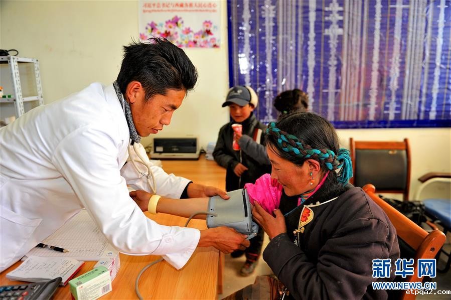 普玛江塘乡卫生院全科医生旺扎为农牧民查体(2018年1月14日摄)。2014年,旺扎从西藏藏医学院毕业,来到条件艰苦的乡卫生院工作,承担全乡282户近1100人的卫生保健任务。新华社记者张汝锋摄