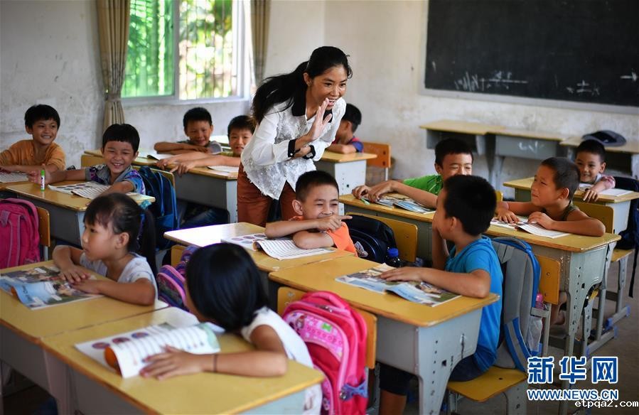 特岗乡村英语教师黄妮娜(中)在海南省保亭黎族苗族自治县保城镇西坡小学上课(2017年9月4日摄)。她分管三个小学,每周要上27节课。新华社记者郭程摄