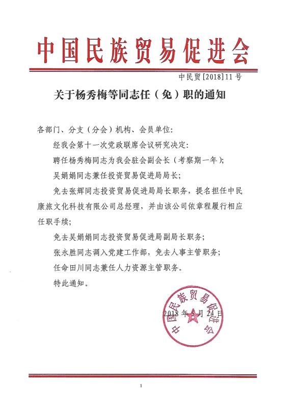 免去张辉同志投资贸易促进局局长职务,提名担任中民康旅文化科技有限公司总经理,并由该公司依章程履行相应任职手续;
