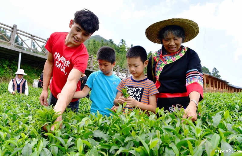 8月5日,游客在玛坑乡的生态观光茶园里体验采茶乐趣。