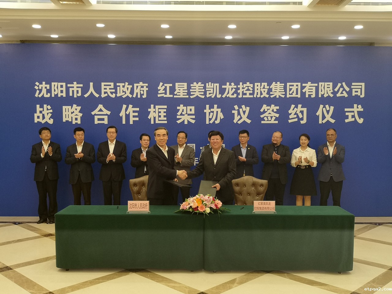 李松林(前左)与潘平(前右)分别代表沈阳市与红星美凯龙签署协议