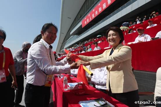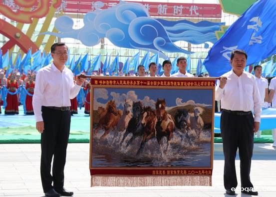 内蒙古自治区党委副书记、政府主席布小林将象征公平竞赛和拼搏奋进的马术比赛终点信号旗授予本次比赛的裁判长