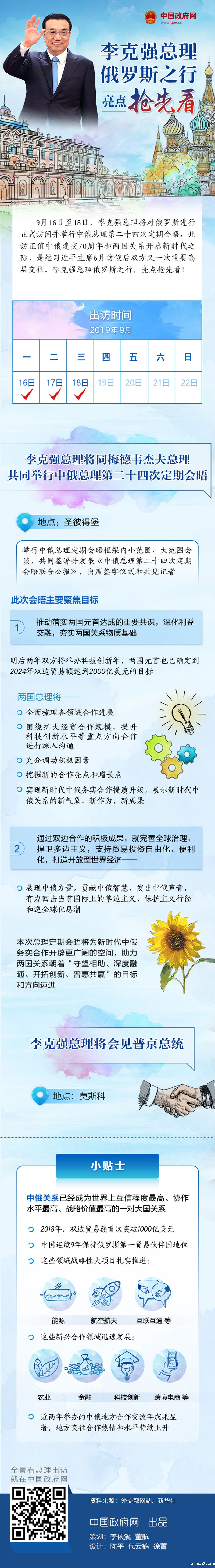 李克强总理9月16日上午乘专机离京,对俄罗斯进行正式访问并举行中俄总理第二十四次定期会晤。李克强总理此访正值中俄建交70周年和两国关系开启新时代之际。作为统筹推动两国全方位务实合作和人文交往的首要机制,此次中俄总理定期会晤将为新时代中俄务实合作开辟更广阔的空间,助力两国关系朝着“守望相助、深度融通、开拓创新、普惠共赢”的目标和方向迈进。