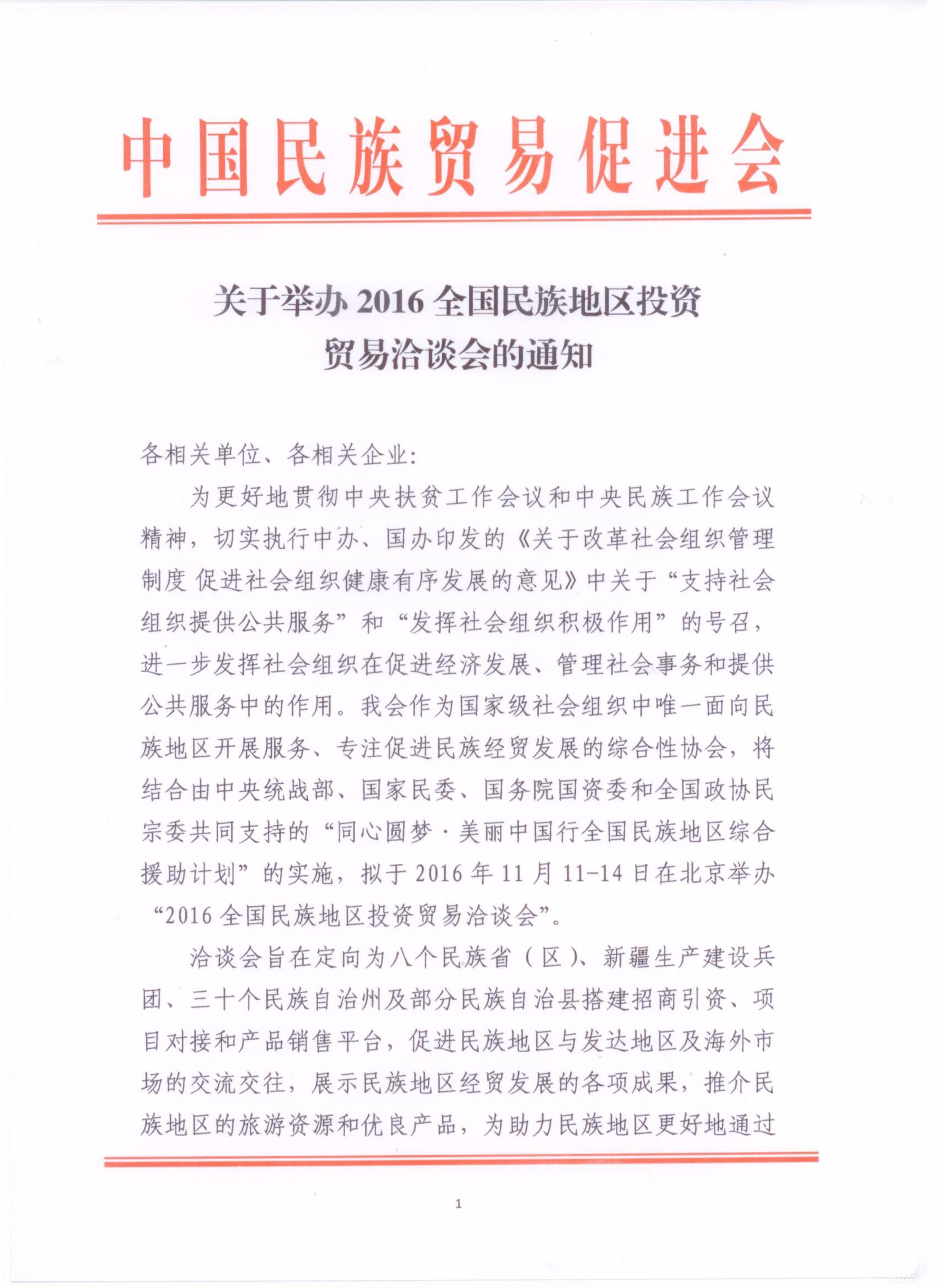 为更好地贯彻中央扶贫工作会议和中央民族工作会议精神,切实执行中办、国办印发的《关于改革社会组织管理制度 促进社会组织健康有序发展的意见》中关于“支持社会组织提供公共服务”和“发挥社会组织积极作用”的号召,进一步发挥社会组织在促进经济发展、管理社会事务和提供公共服务中的作用。我会作为国家级社会组织中唯一面向民族地区开展服务、专注促进民族经贸发展的综合性协会,将结合由中央统战部、国家民委、国务院国资委和全国政协民宗委共同支持的“同心圆梦·美丽中国行全国民族地区综合援助计划”的实施,拟于2016年11月11-14日在北京举办“2016全国民族地区投资贸易洽谈会”。