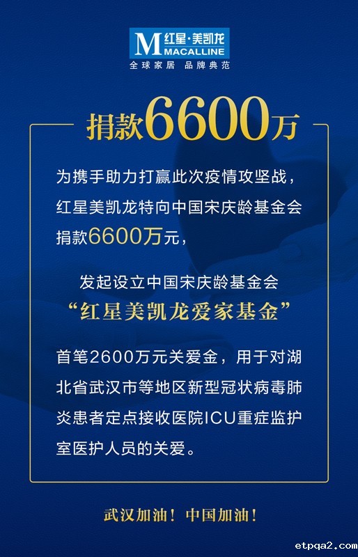 当前,新冠肺炎疫情形势依然严峻复杂,众多国内知名企业纷纷出手驰援武汉,彰显企业社会责任感和使命感。我会理事会主席团单位红星美凯龙家居集团股份有限公司(以下简称“红星美凯龙”)作为行业龙头企业,切实行动为抗击疫情提供支持,特向中国宋庆龄基金会捐款6600万元,并发起设立中国宋庆龄基金会“红星美凯龙爱家基金”。
