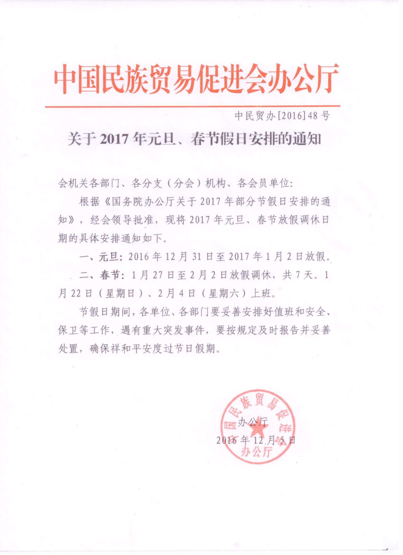 根据《国务院办公厅关于2017年部分节假日安排的通知》,经会领导批准,现将2017年元旦、春节放假调休日期的具体安排通知如下。