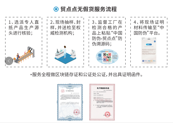 诚信经营,无假货是商家的立店之本。贸点点运用创新的理念和先进的技术手段,联合中国防伪行业协会,将向商家及品牌方提供高效、透明、有公信力的第三方品质保障及赋能服务。贸点点会选派专业品控审核人员触达产品生产现场,开展源头核验、抽样、封样、送检、监督贴标等服务,证明产品真实性。同时将现场抽检的每批次号产品进行质量检测,确保产品质量。贸点点的服务过程全透明,商家或政府管理机构可通过贸点点平台的直播、视频、音频和图文传送功能对贸点点品控审核人员的服务全过程进行监督、指导和互动。并且服务全程会通过区块链存证和公证处公证手段进行证据链留存,为可能出现的消费纠纷事先留存了充足的权威证据链。通过这些手段,可以有效助力杭城无假货示范商业街的商家强化产品质量和可信度、提升品牌形象及效益。