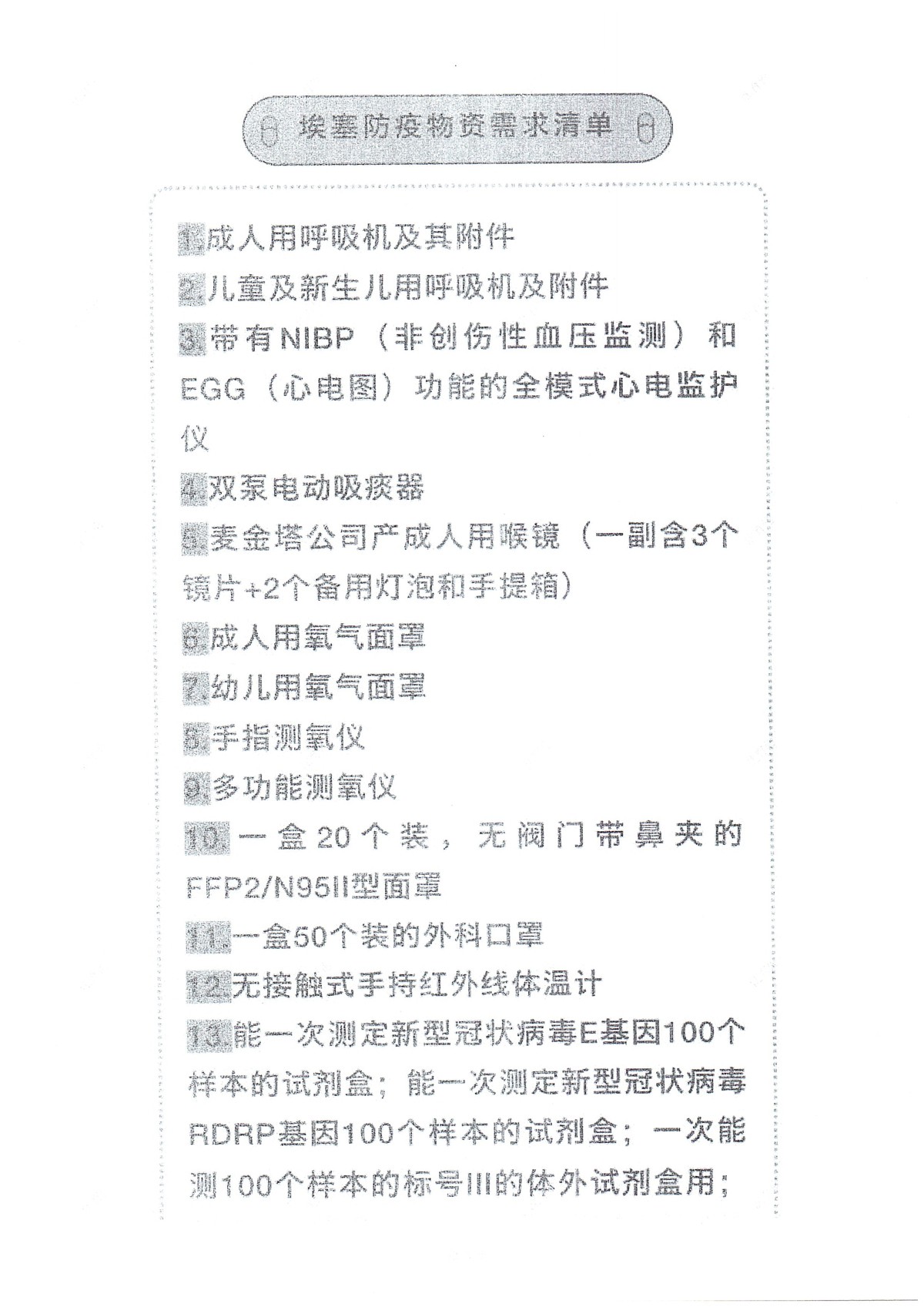 日前,我会收到埃塞俄比亚驻华大使馆抗疫物资求助函。自2020年3月13日以来,埃塞俄比亚已有确诊的新冠肺炎病例已在隔离中心接受治疗。埃方政府目前正在不分昼夜工作,在国家和地方设立工作小组,加强应急准备和反应。现在,埃塞俄比亚公共卫生部门已列出了一份埃塞当下严重短缺的医疗物资清单,期望在最短的时间内收到捐赠,他们比任何时候都更需要我们的援助和慈善支持,以及专门为采购医疗用品和设备提供资金,这些物资和设备将用于防治疫情在埃塞俄比亚国内蔓延。埃方保证,将把此次企业的爱心捐赠作为中埃友好人民在艰难时刻表现出友好团结的最好见证。