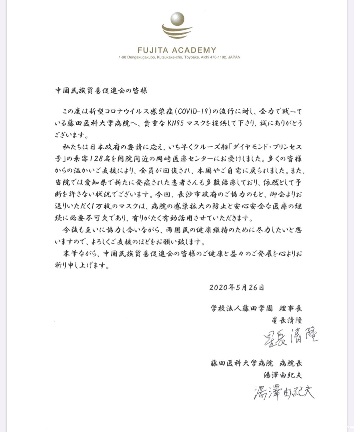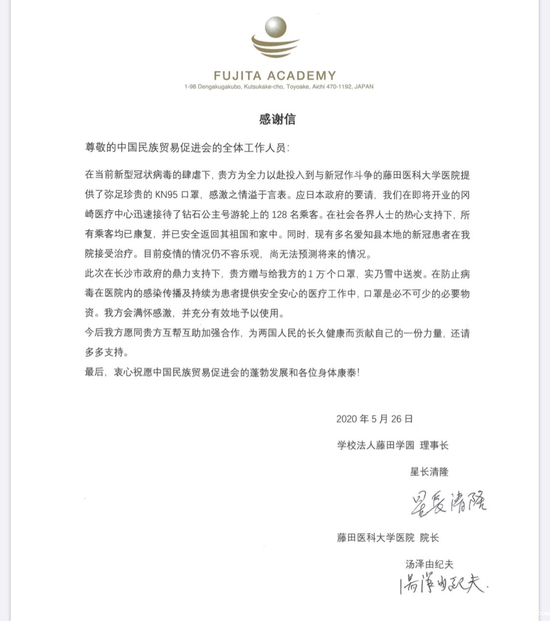 大爱,无关国界。近日,我会收到来自日本国爱知县藤田医科大学附属医院(以下简称“藤田医院”)的一封感谢函。藤田医科大学理事长星长清隆及附属医院院长汤泽由纪夫在函中对我会大力筹措捐赠医疗物资的义举深表感谢,并表示此次向藤田医院捐赠的1万只KN95口罩对抗击病毒在医院内感染传播及持续为患者提供安全安心的医疗工作提供了有效保障,日方医护工作人纷纷点赞我会捐赠行为,希望今后双方能够互帮互助、加强合作,为两国人民的长久健康贡献力量。