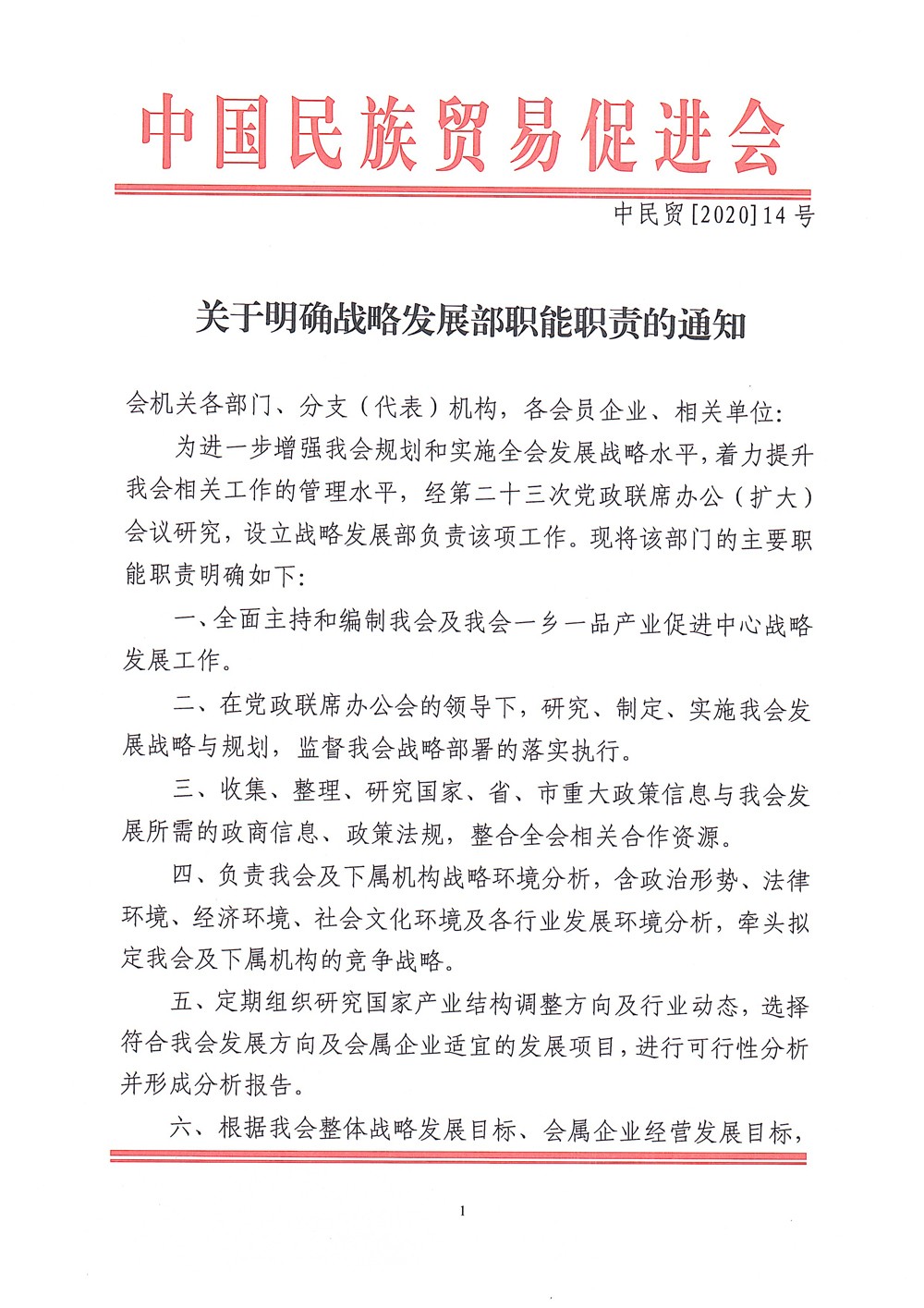 为进一步增强我会规划和实施全会发展战略水平,着力提升我会相关工作的管理水平,经第二十三次党政联席办公(扩大)会议研究,设立战略发展部负责该项工作。现将该部门的主要职能职责明确如下:
