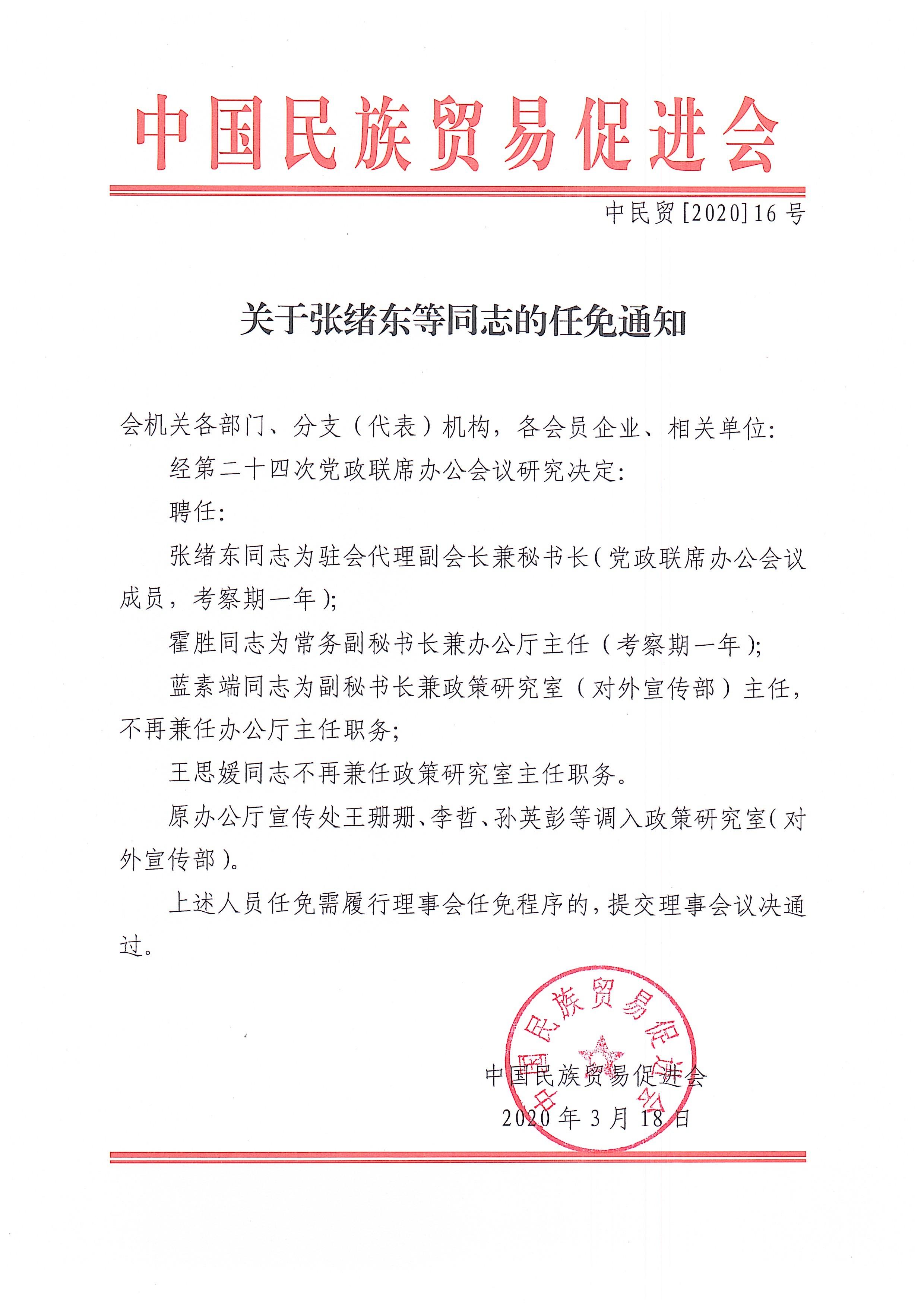 张绪东同志为驻会代理副会长兼秘书长(党政联席办公会议成员,考察期一年);
