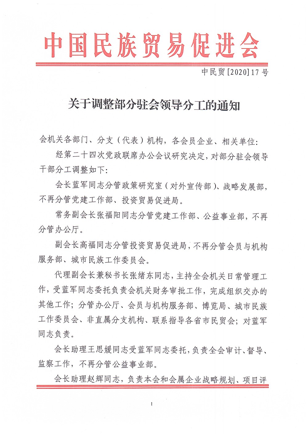 会长蓝军同志分管政策研究室(对外宣传部)、战略发展部,不再分管党建工作部、投资贸易促进局。