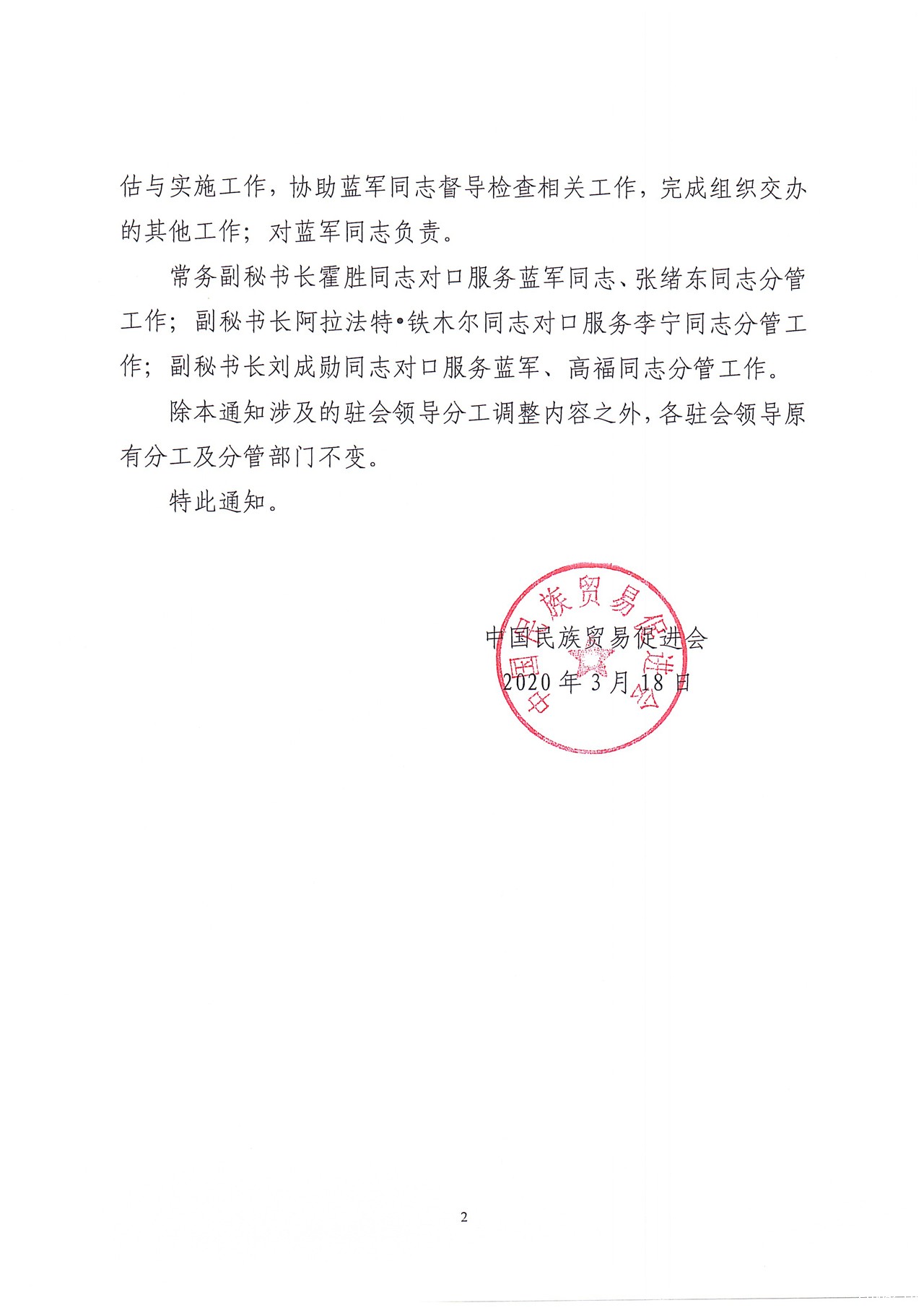 副会长高福同志分管投资贸易促进局,不再分管会员与机构服务部、城市民族工作委员会。