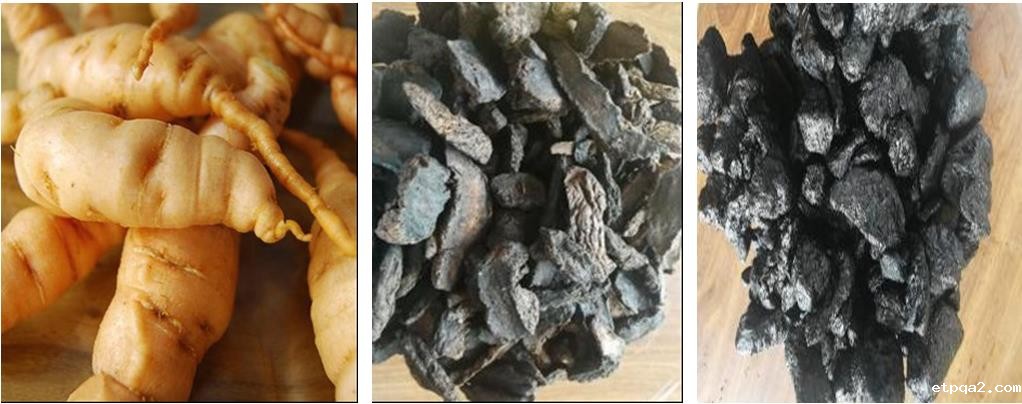 鲜地黄(左)、生地黄(中)、熟地黄(右)