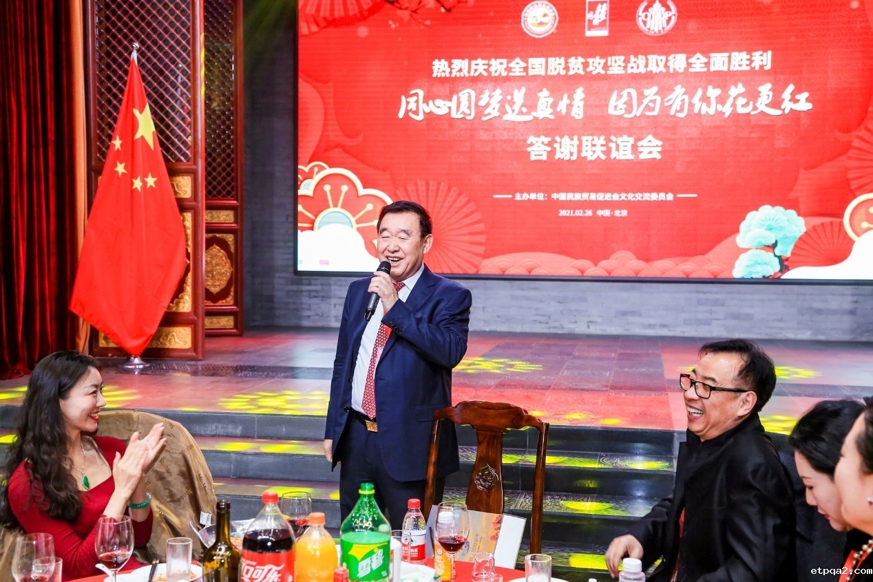 2月26日,由我会文化交流委员会主办的 “同心圆梦送真情•因为有你花更红”——答谢联谊会在会机关阳光礼堂成功举办。我会会长蓝军,理事会常务主席张保和,监事会监事长蔡国斌,副会长高福等出席会议。来自全国各地的嘉宾代表欢聚一堂,共同庆祝全国脱贫攻坚战取得全面胜利,畅谈经验收获、共度元宵佳节。