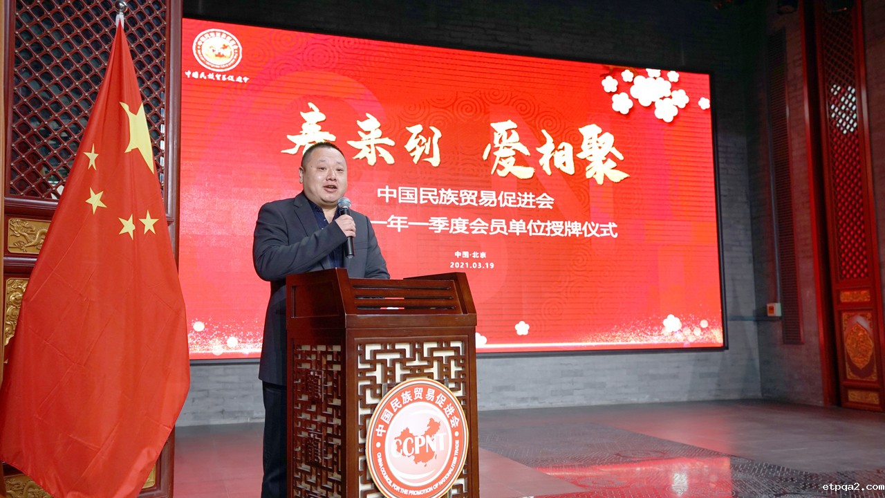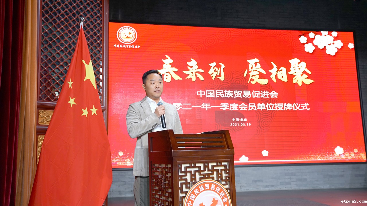 3月19日上午,以“春来到 爱相聚”为主题的中国民贸2021年一季度会员单位授牌仪式在我会阳光礼堂隆重举行。我会副会长牟婷,会长助理赵辉,会长助理兼投资贸易促进局局长刘成勋,融媒体中心主任霍胜,中民康旅文化科技有限公司董事长李垠启等会内领导、部分会员企业负责人及全会各部门干部职工共50余人出席仪式。
