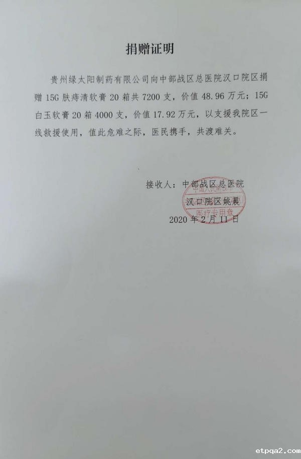 此外,贵州绿太阳制药有限公司在去年新冠疫情爆发初期便向武汉疫情灾区捐赠价值720万元药品。作为中国民贸的会员企业,在灾情发生后,绿太阳第一时间做出反映,迅速积极投入到抗击灾情当中。关键时刻体现出了我会会员企业、企业家的社会责任与担当。