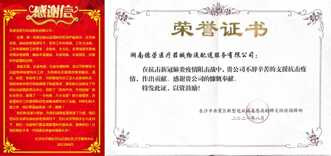 疫情紧急,当挺身而出,共克时艰。德荣医疗的队伍中也涌现出了许多积极奉献的员工,冲锋在疫情防控第一线,为基层医疗机构送去医疗物资,加入疫情防控志愿者队伍,在疫情防控期间,他们充当着“宣传员”“辅导员”“排查员”“值班员”“送货员”……,对此,社会各界给予了广泛好评,岳麓区新冠肺炎防控指挥部向德荣医疗颁发发来了荣誉证书,开福区洪山桥街道社区卫生服务中心也发出来了感谢信,感谢德荣医疗在支援抗击疫情中作出的贡献。