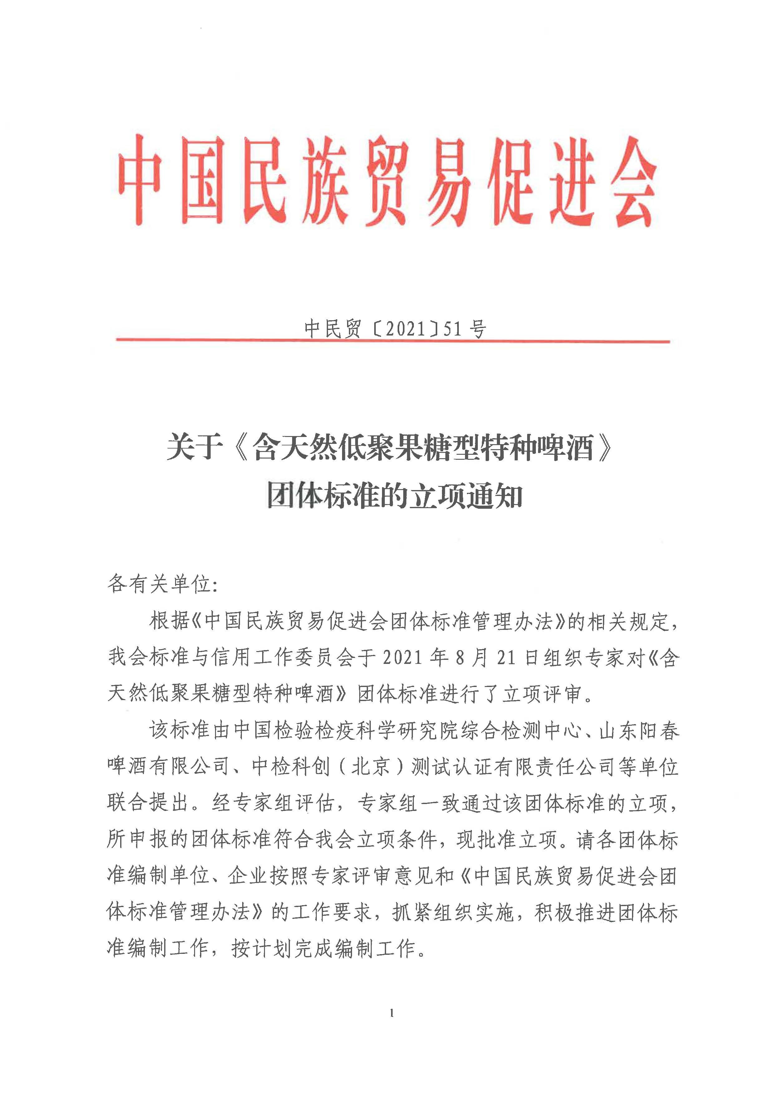 关于《含天然低聚果糖型特种啤酒》团体标准的立项通知