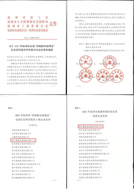 耀厦集团荣获“2021年度杭州市企业社会责任建设A级企业”“杭州市创建和谐劳动关系先进企业”荣誉称号