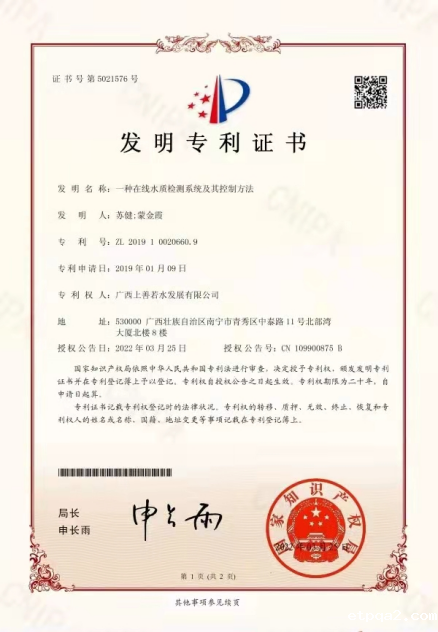 日前,由本会常务理事会员单位广西北投环保水务集团有限公司直属企业广西上善若水发展有限公司自主研发的“一种在线水质检测系统及其控制方法”获国家知识产权局授权。