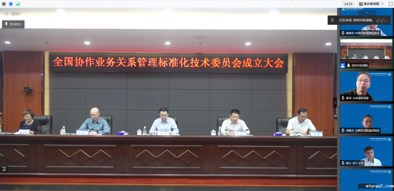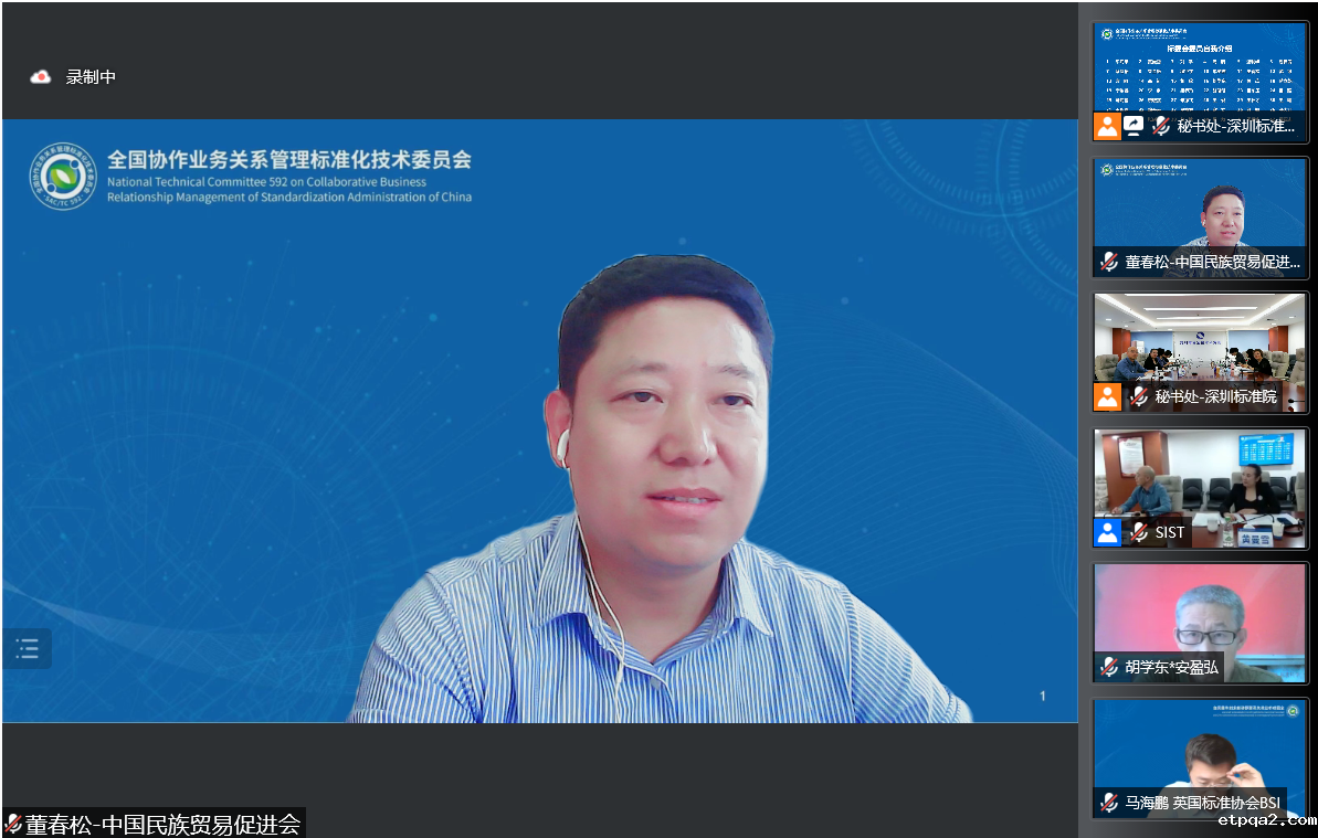 会议由深圳市市场监督管理局标准处处长史诗祯主持,国家市场监管总局标准技术管理司服务业处领导宣读了全国协作业务关系管理标准化技术委员会成立批文及委员名单,深圳市标准技术研究院和华为技术有限公司作为该技术委员会秘书处和委员代表做了发言。来自深圳市腾讯计算机系统有限公司、中国食品工业协会、中国国际贸易促进委员会商业行业委员会、深圳市医疗器械行业协会、英标认证技术培训(北京)有限公司的委员们线上分享了协作业务关系管理相关行业实践情况。当天下午,委员们围绕着委员会管理制度、协作关系管理领域国家标准体系框架、国际标准及国家标准提案以及下一步工作计划等内容召开了工作会议。