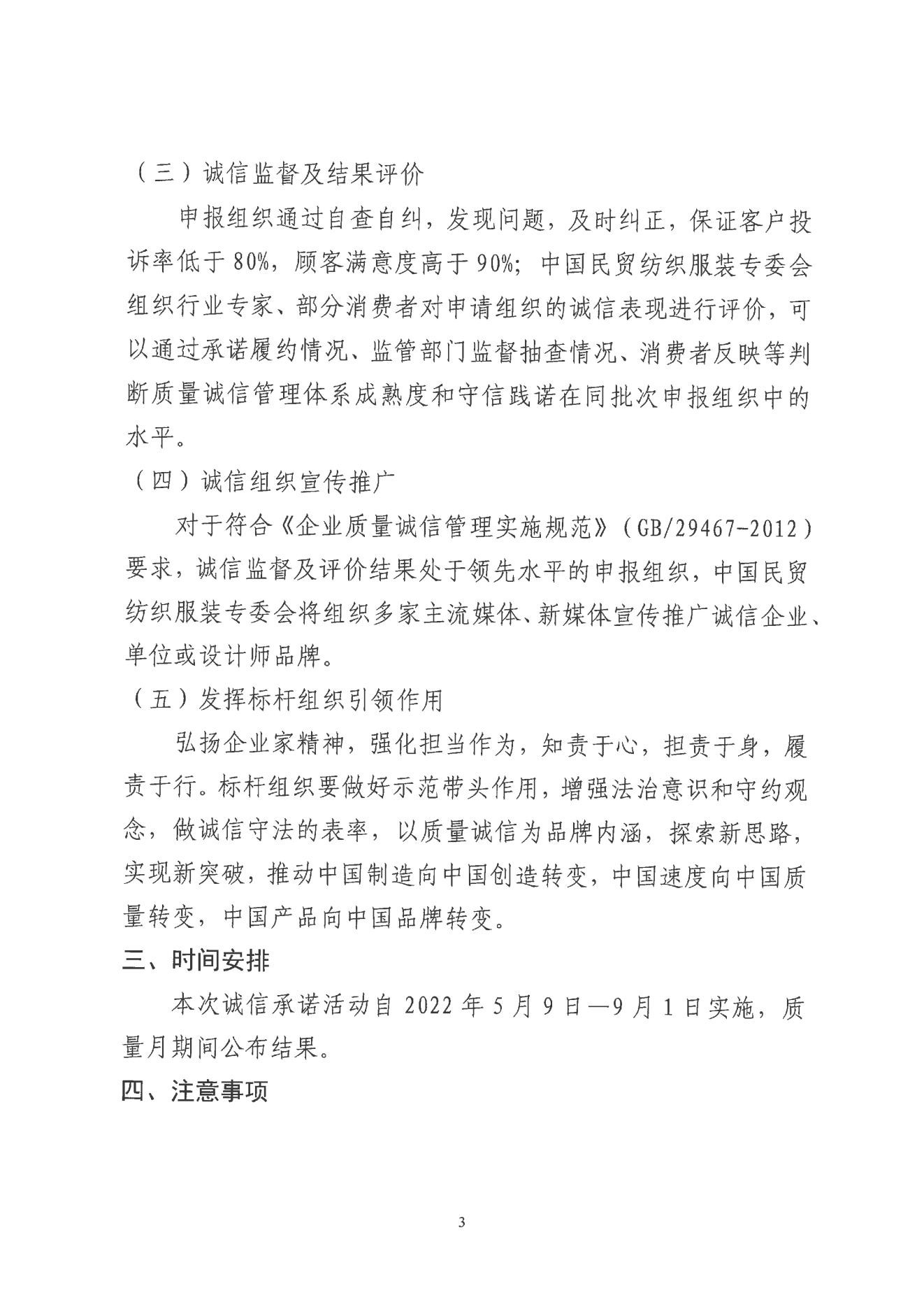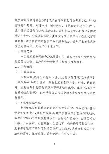 为深入贯彻《意见》精神,进一步推进社会信用体系建设高质量发展,促进形成有利于基于国内大循环、国内国际双循环新发展格局,落实“培育一大批诚信经营、守信践诺的标杆企业”具体要求,必威betway中文网页纺织服装专业委员会(简称中国民贸纺织服装专委会)拟于近日在纺织服装行业开展2022年“诚信承诺”活动,建设一批“诚信经营、守信践诺的标杆企业”,推动国家品牌价值评价指标体系、国家市场监管部门在“全国质量月”宣传、实施缺陷风险分类监管等方面采信标杆企业诚信管理数据,扩大国内市场优质产品和服务供给,提升产业链供应链安全可控水平。具体工作要求如下: