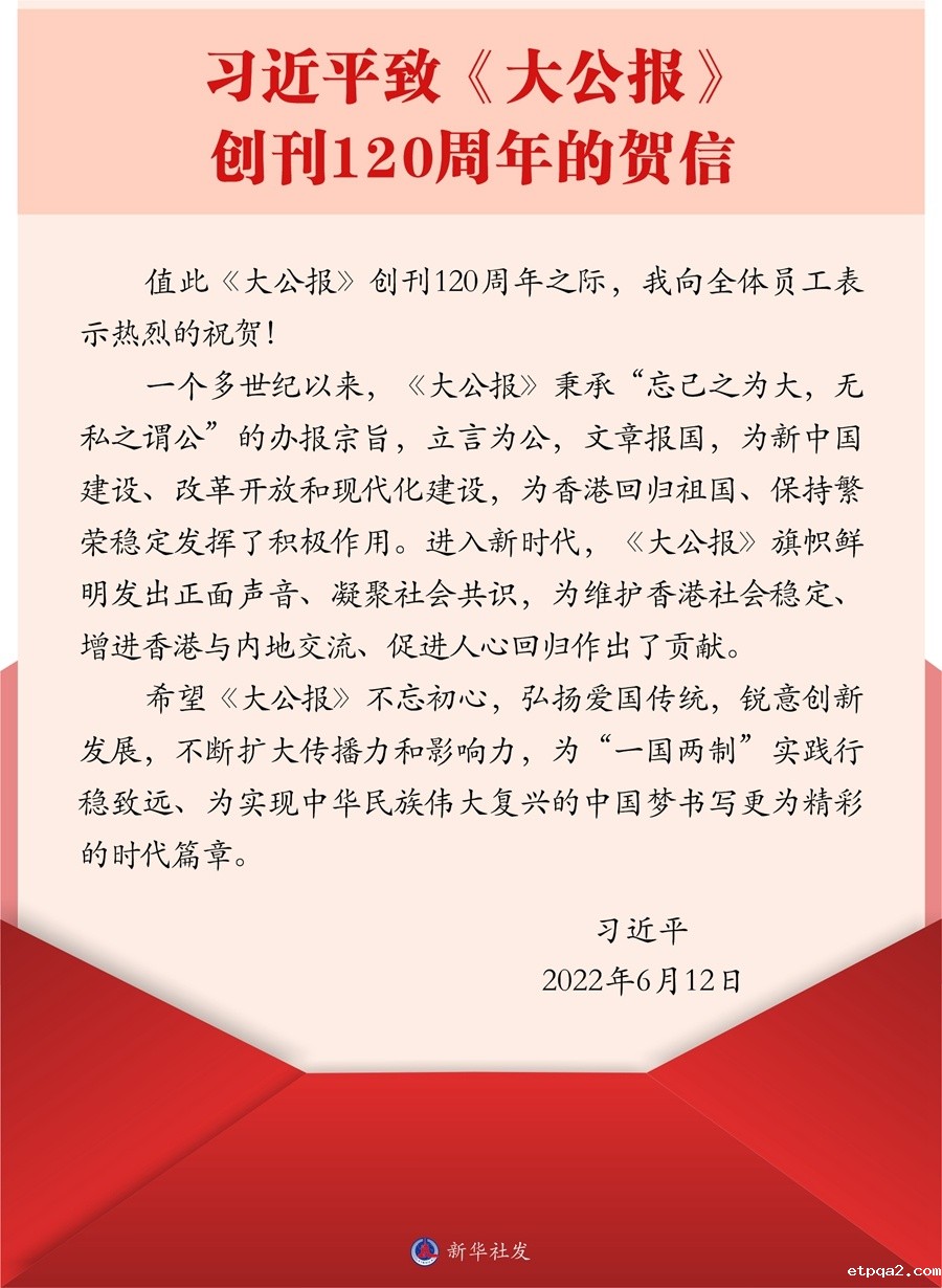 习近平在贺信中指出,一个多世纪以来,《大公报》秉承“忘己之为大,无私之谓公”的办报宗旨,立言为公,文章报国,为新中国建设、改革开放和现代化建设,为香港回归祖国、保持繁荣稳定发挥了积极作用。进入新时代,《大公报》旗帜鲜明发出正面声音、凝聚社会共识,为维护香港社会稳定、增进香港与内地交流、促进人心回归作出了贡献。