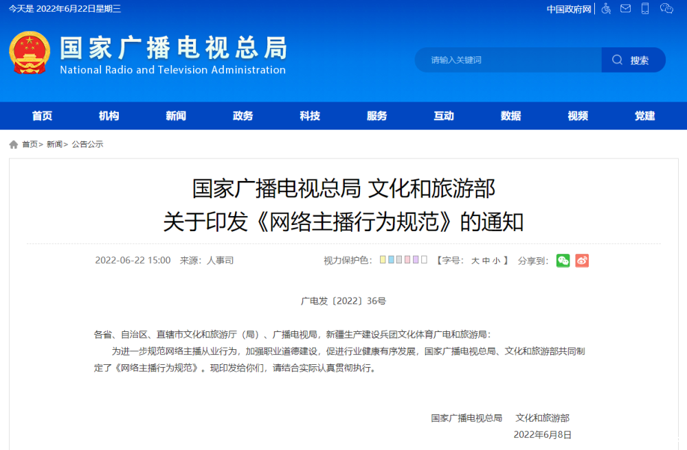 为进一步规范网络主播从业行为,加强职业道德建设,促进行业健康有序发展,国家广播电视总局、文化和旅游部共同制定了《网络主播行为规范》。现印发给你们,请结合实际认真贯彻执行。