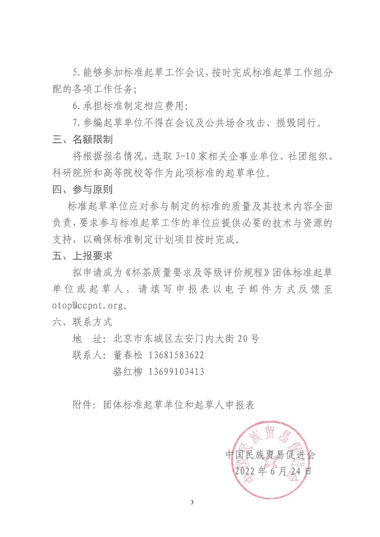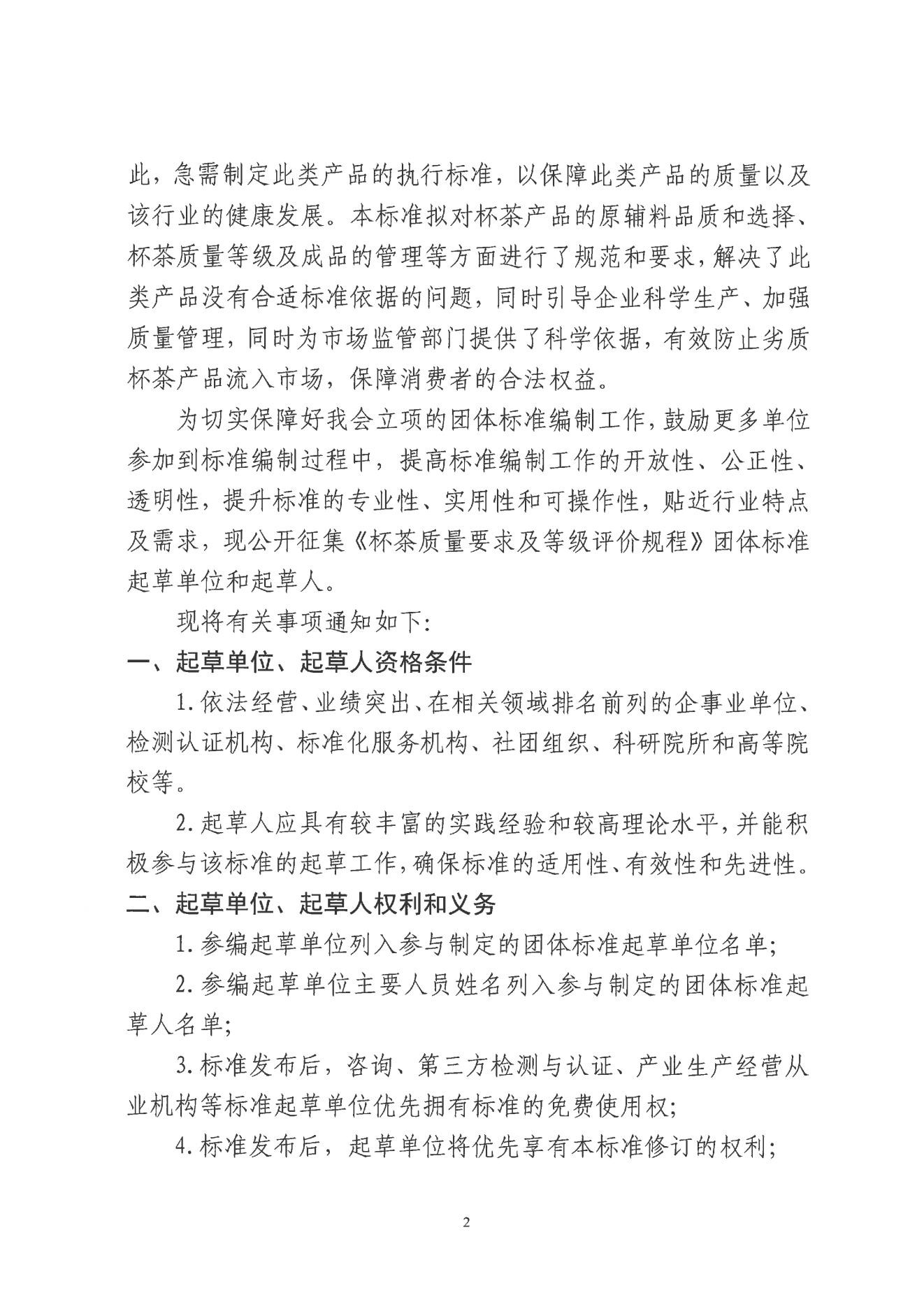 为切实保障好我会立项的团体标准编制工作,鼓励更多单位参加到标准编制过程中,提高标准编制工作的开放性、公正性、透明性,提升标准的专业性、实用性和可操作性,贴近行业特点及需求,现公开征集《杯茶质量要求及等级评价规程》团体标准起草单位和起草人。
