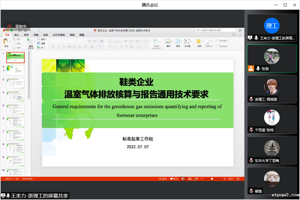 浙江理工大学服装学院副教授、硕士生导师王来力作为起草组执笔代表,从《产品碳足迹 产品种类规则 鞋类产品》等两项标准研制的背景、意义、立项创新性、标准范围、引用文件、术语和定义等维度做了详细说明。