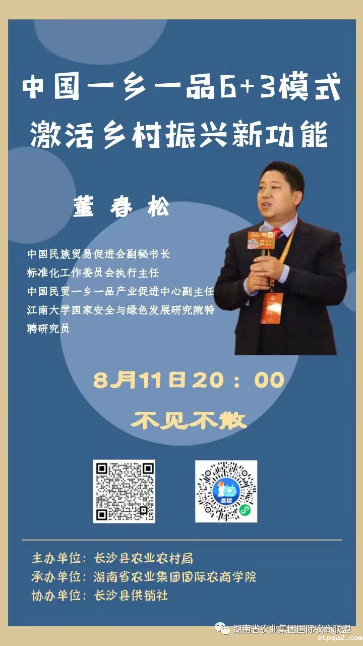 8月11日,由长沙县农业农村局主办、湖南省农业集团国际农商学院承办、长沙县供销社协办的第四期乡村振兴系列云课程通过线上直播成功举办,本期云课程的主题为“中国betway必威西汉“6+3”模式激活乡村振兴新动能”,本会副秘书长、标准化工作委员会执行主任董春松受邀做专项分享,与乡村振兴有关的政府、科研机构、企事业单位等机构代表二百余人线上参加培训和交流。