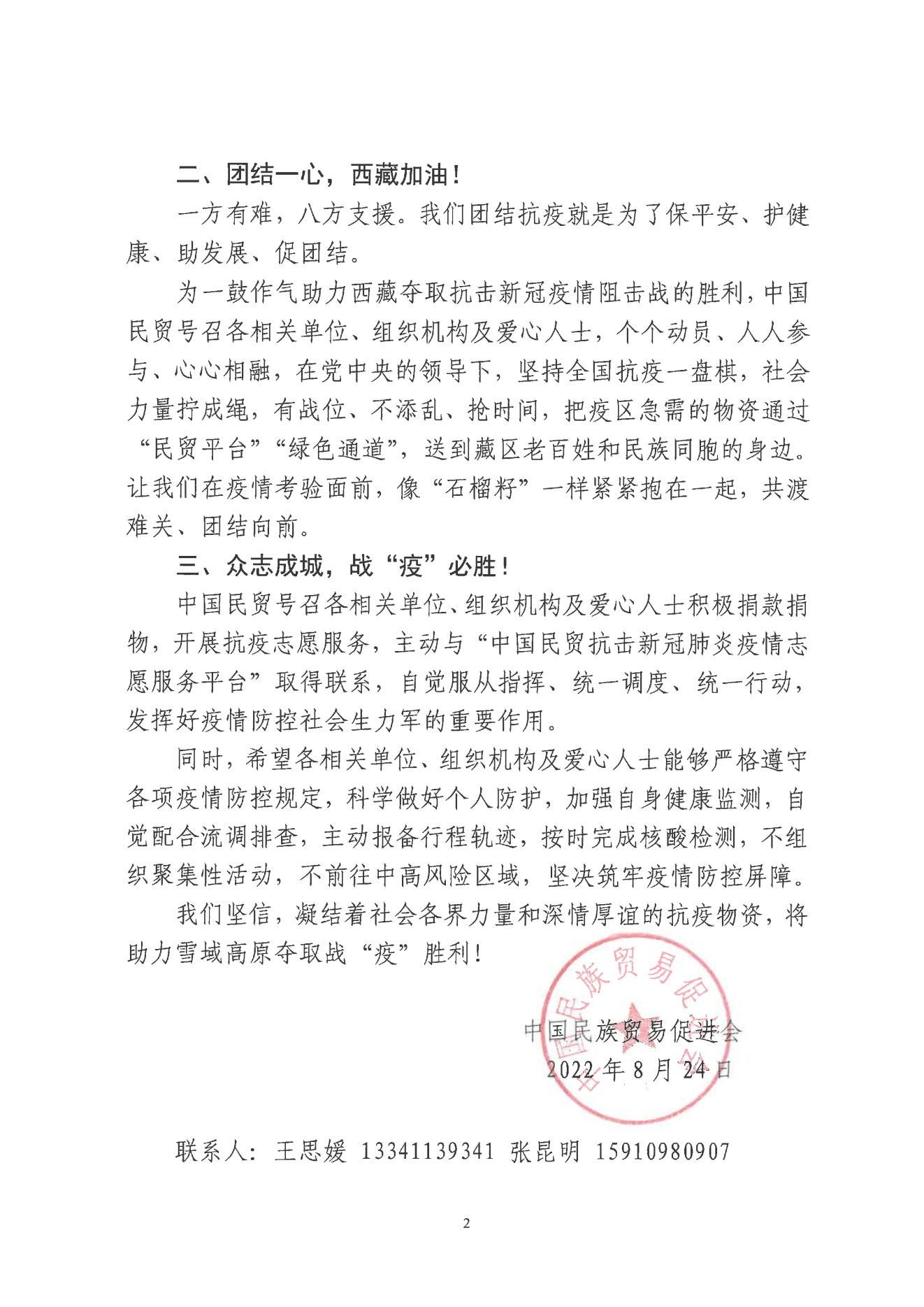 【编者按】近期,西藏多地突发新一轮新冠疫情,正处于精准防控的关键时刻。“疫情就是命令、防控就是责任”,必威betway中文网页作为全国唯一一家专注民族地区经济发展和团结进步的社会组织,积极履行社会责任,快速响应、率先行动,在此向社会各界发出倡议,希望大家迅速行动进来,积极组织力量筹措物资,在最短时间内助力西藏打赢这场疫情防控阻击战、歼灭战。倡议书号召各相关单位、组织机构及爱心人士,主动与“中国民贸抗击新冠肺炎疫情志愿服务平台”联系,把疫区急需的物资送到藏区老百姓和民族同胞的身边,让藏区人民深切感受到祖国大家庭的温暖,助力雪域高原夺取战“疫”胜利!