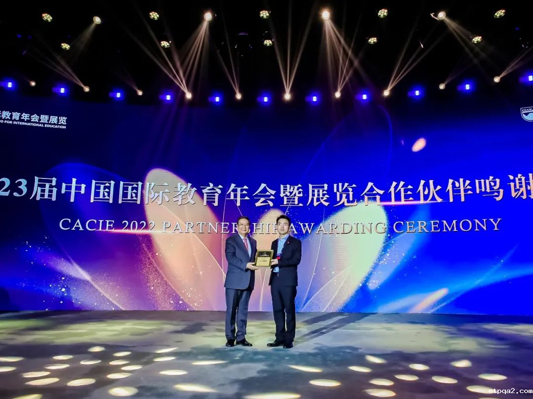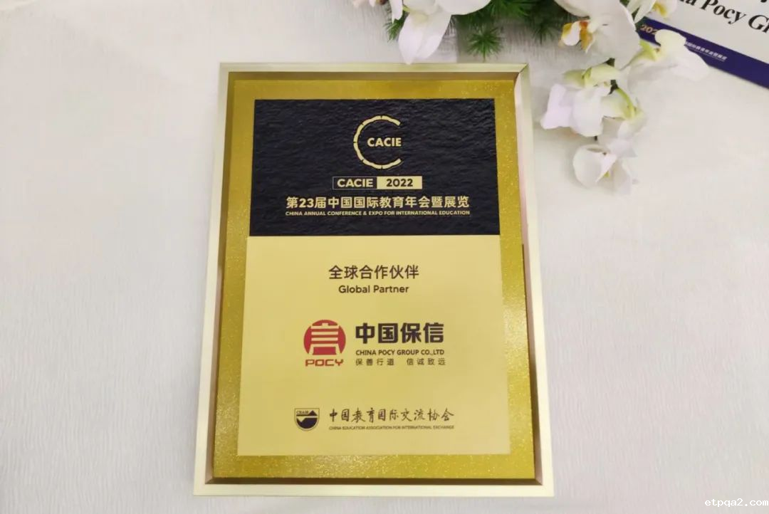 在CACIE之夜,中国保信集团再度荣膺“全球合作伙伴”,中国教育国际交流协会会长刘利民为中国保信集团常务副总裁杨智淋颁奖。