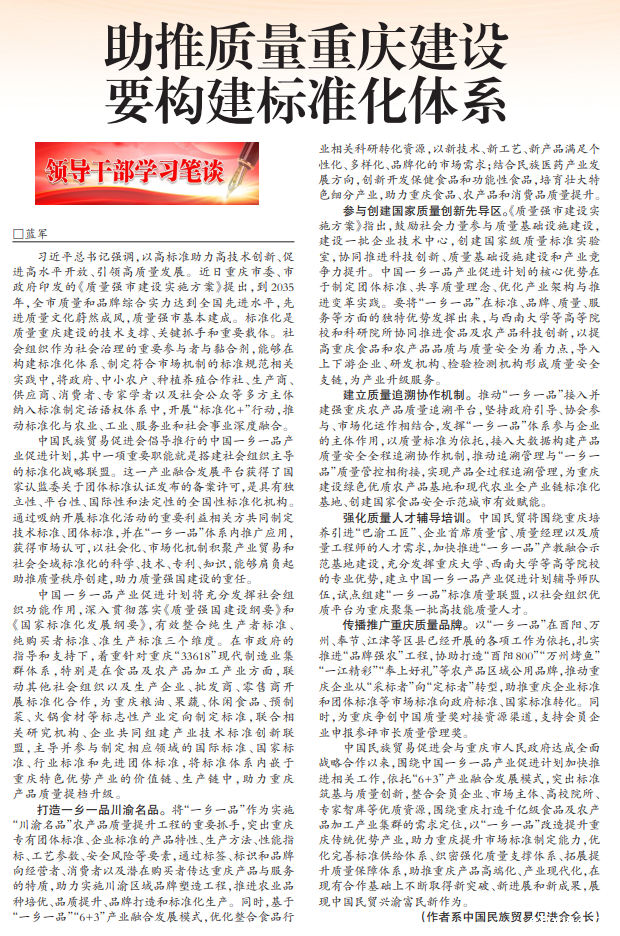 《重庆日报》发表蓝军会长署名文章:助推质量重庆建设要构建标准化体系
