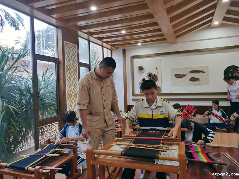 有的学生席地而坐,腰上固定着腰织机的一端、足尖撑起另一端的脚踏;有的学生坐在织机前,在老师的指导下认真学习黎锦技艺……在三亚市逸夫中学黎锦课堂上,该校邀请国家级非遗代表性项目黎族传统纺染织绣技艺省级代表性传承人参与教学,经过学习,学生们不仅大多已掌握基本的织锦技艺,更有学生在赛事上大放异彩,在今年2023年三亚市“三月三”黎苗绣技艺竞赛上,该校学生斩获少年组第一名的佳绩,逸夫中学荣获黎苗绣竞赛优秀组织奖。