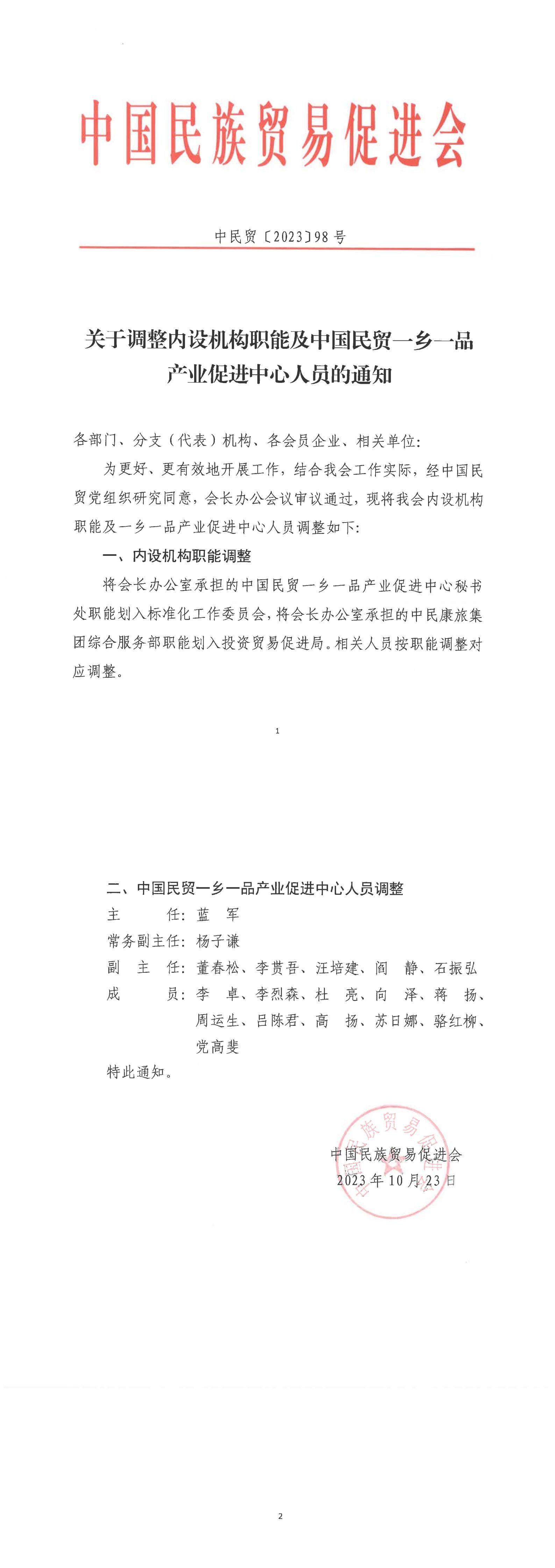 关于调整内设机构职能及中国民贸betway必威西汉 产业促进中心人员的通知