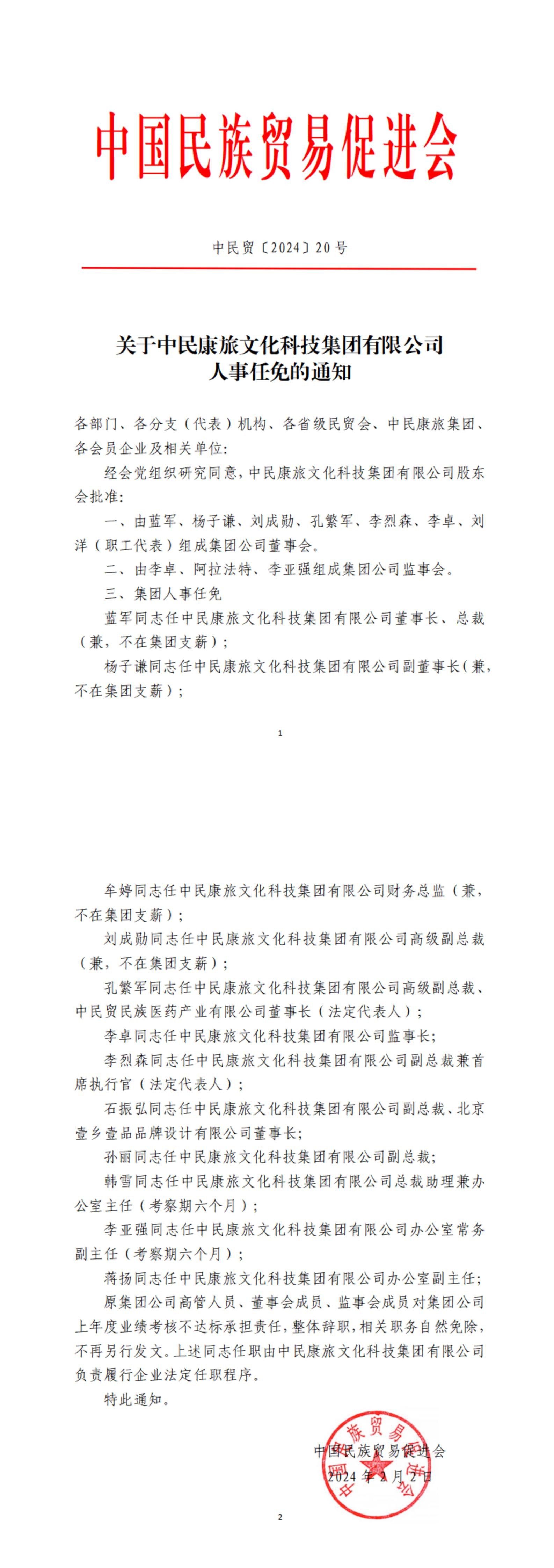 关于中民康旅文化科技集团有限公司人事任免的通知
