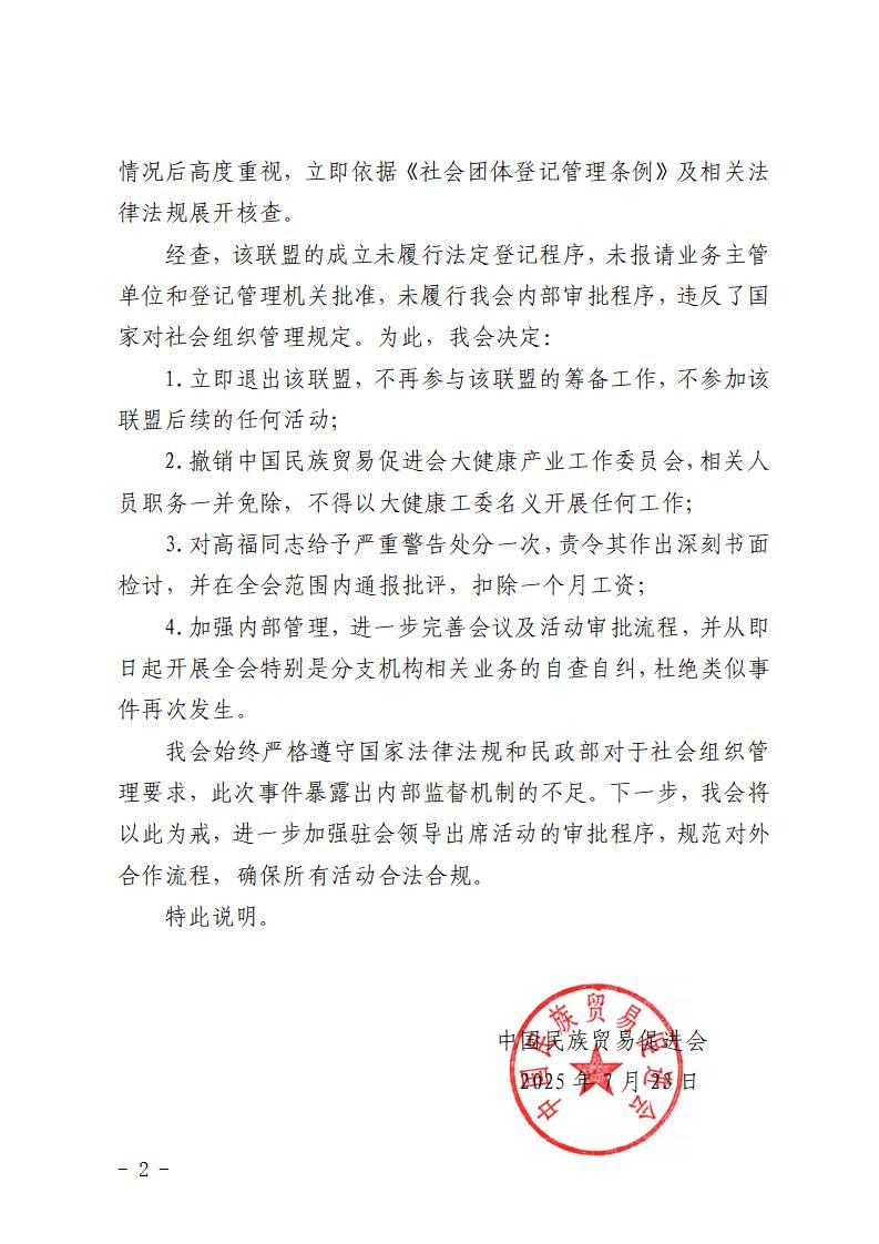 关于处理中国民贸大健康产业工作委员会参加中国民族医药大健康产业国际联盟的情况说明